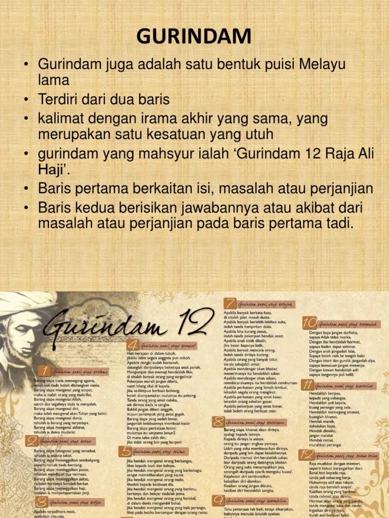 Pasti akan disiksa di akhirat. Dadanya berbentuk lebar dan bidang 3. Gurindam adalah puisi lama (melayu) yang sangat penting sebagai warisan budaya. Ajukan pertanyaan tentang tugas sekolahmu. Gurindam memiliki dua buah baris pada setiap baitnya.